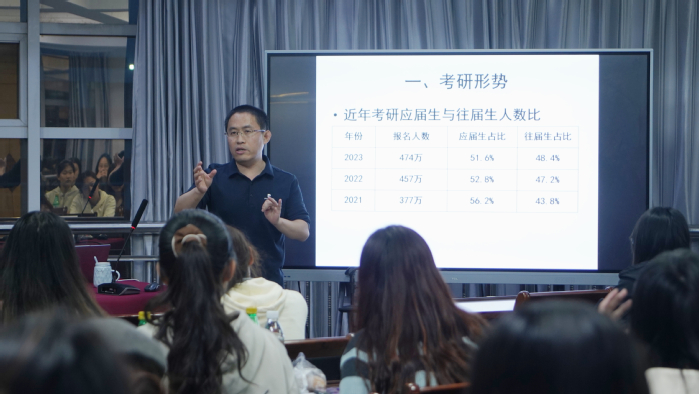 讲座中,常如瑜介绍了考研的最新形势,包括报录比、录取分数及录取趋势等,根据学院实际,他具体分析了各相关专业的考研要点,建议同学们要善于打破信息差,多途径了解报考院校和专业信息,重视院校和专业的选择;在选择过程中,要从学校招生情况、本科专业学习情况及未来就业方向等多维度进行综合考量。随后,常如瑜从考研基本流程、考试准备等方面为同学们进行了详细指导。他表示,考研、考编不仅仅是一场知识的比拼,更是一场心态的比拼;在复习过程中,同学们不仅要制定高效学习计划,注意学习方法,还要保持良好的心态,增强自信心。讲座结束后,常如瑜还与同学们进行了交流,为同学们答疑解惑。