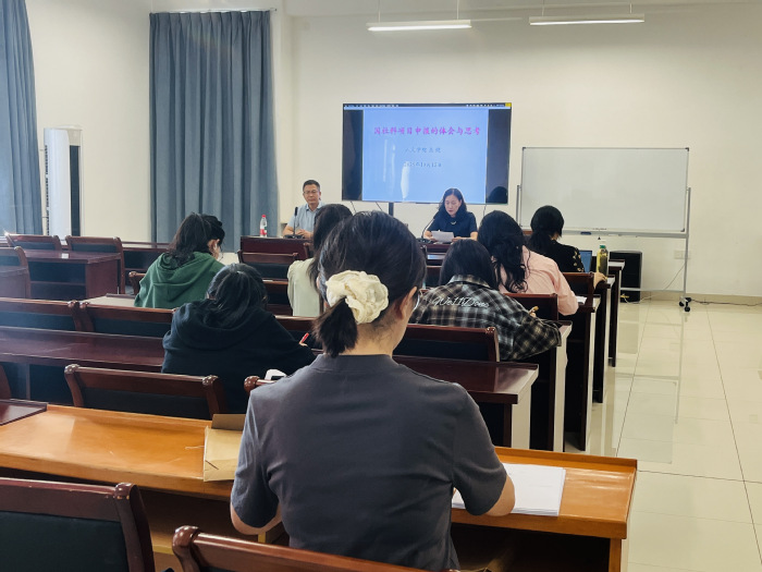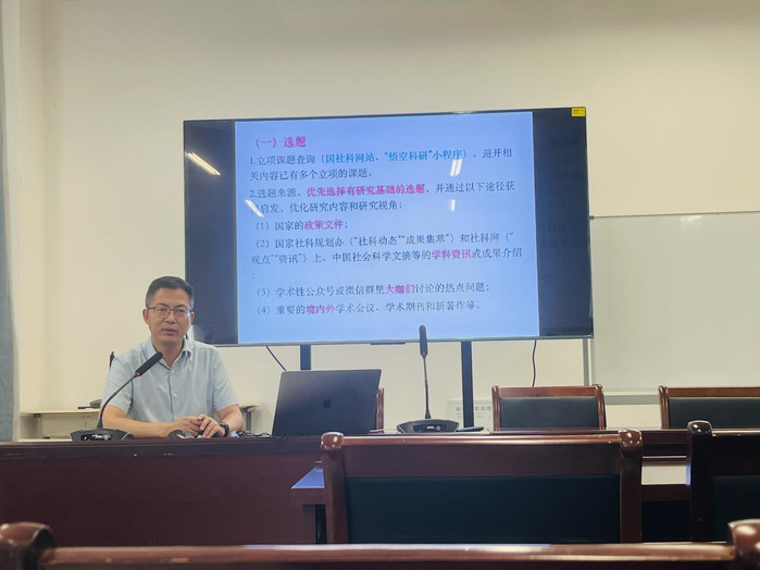 分享会上,吴健书记结合国社科项目申报经历,从“大”“中”“小”三个层面分别阐述选题来源、设计论证、文献综述、创新价值、研究可行性、研究基础等方面的写作经验,凸显学科理论、研究视角和方法创新的重要性,并在意见征求、格式规范、语言表述和资料收集上分享诸多建议。整场报告内容完整、分析透彻,与会教师受益良多。