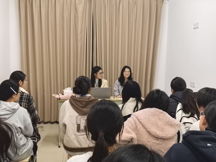 况丹围绕《网络短剧中秘书形象刻板印象分析》创新创业项目进行了选题构思、团队组织、论文发表等方面的经验分享。在选题环节,她建议同学们结合专业背景和时代热点,聚焦具体问题进行研究,避免范围过宽;文献查阅方面,她提醒同学们要充分利用学校图书馆和知网等资源,并主动向老师请教;团队协作方面,她建议同学们跨专业组队实现优势互补,明确分工并开展定期会议进行复盘、规划,鼓励同学们积极进行项目申报。随后,洪雅轩进行了CET-4备考经验分享,她强调了研读真题的重要作用,提醒同学们在备考中多做练习,优先攻克分数占比高的阅读理解题目,在听力方面可借助影视剧培养语感;同时,她向同学们推荐了网络备考资源,鼓励同学们积极备考。分享结束后,在场同学进行了深入的交流。