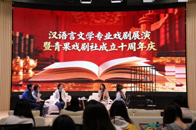今年,青果戏剧社迎来了创社十周年庆典,在剧社精心准备的“屣迹”主题对谈环节中,青果戏剧社创始人谢燕红院长、董长春老师、于士倬老师及往届社长代表先后发言,回忆剧社初创期的经历,介绍剧社在课程融合、排练训练、演出实践等方面的探索成果,并对剧社下一阶段的建设提出建议与期望。大家一致认为,十年来,青果剧社在丰富校园文化、培养学生艺术素养等方面发挥了积极作用,已成为人文学院特色文化品牌之一。未来,剧社将继续深化戏剧艺术与校园文化的融合,搭建更广阔的实践平台,为激发学生艺术兴趣、提升审美与创造能力持续贡献力量。